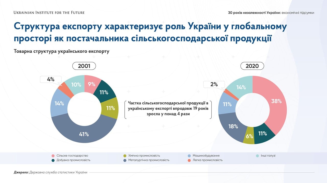 «Так, структура експорту характеризує роль України у глобальному просторі як постачальника сільськогосподарської продукції. Зокрема, частка промислової продукції в українському експорті з 2001 року скоротилася на третину (на 28 в.п.).  А частка металургійної промисловості скоротилася більш ніж вдвічі (на 23 в.п. )